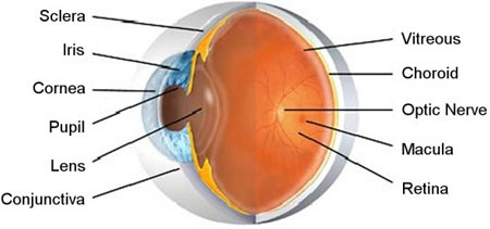 Eye is like a camera. The external object is seen like the camera takes the picture of any object. Light enters the eye through a small hole called the pupil and is focused on the retina, which is like a camera film. Eye also has a focusing lens, which focuses images from different distances on the retina. The colored ring of the eye, the iris, acts as shutter and controls the amount of light entering the eye. It’s diameter decrease when light is bright and increase when light is dim. A tough white sheet called sclera covers the outside of the eye. Front of this sheet (sclera) is transparent in order to allow the light to enter the eye, the cornea. Ciliary muscles in ciliary body control the focusing of lens automatically. Choroid forms the vascular layer of the eye supplying nutrition to the eye structures. A jelly like substance called vitreous humor fill the space between lens and retina. The lens, iris and cornea are nourished by clear fluid, aqueous humor, formed by the ciliary body and fill the space between lens and cornea. This space is known as anterior chamber. The fluid flows from ciliary body to the pupil and is absorbed through the channels in the angle of anterior chamber. The delicate balance of aqueous production and absorption controls pressure within the eye.