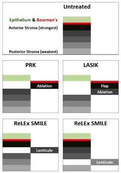 Figure 5. This is a diagrammatic demonstration showing the difference in strength of the remaining stroma after PRK, LASIK, and ReLEx SMILE. These diagrams show that the strength of the stroma remaining after ReLEx SMILE is greater than the equivalent treatment as both PRK and LASIK. The fact that Bowman's layer remains intact will also provide added strength. Finally, the two diagrams for ReLEx SMILE show the even greater strength if the lenticule is removed from deeper within the stroma.