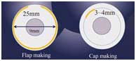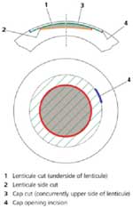 Figure 3. Incision geometry of the ReLEx SMILE procedure. The lenticule cut is performed (the underside of the lenticule), followed by the lenticule sidecuts. Next, the cap interface is created (the upper side of the lenticule), and finally a 2- to 3-mm small incision is created super-temporally. The lenticule interfaces are separated using a flap separator, and the lenticule is extracted manually, all via the small incision.